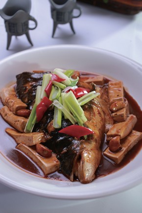 份量大到可供給全家人食用的「乾隆魚頭豆腐」則是劉永康造訪江蘇時習得的道地料理,劉永康選用富含膠質的3斤重大頭鰱魚,稍微炸過再以甜麵醬等調味長時間蒸煮,隨著小火慢烹,魚頭與豆腐吸附了湯汁,更顯鮮香,鹹甘韻味令人回味,重現乾隆皇也讚不絕口的好滋味。