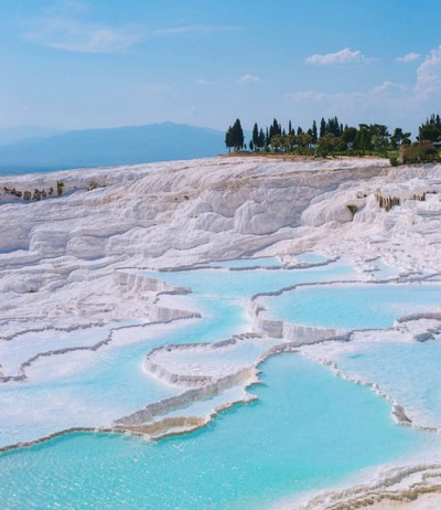 地底下溫泉流經含有鈣質成分的石灰岩層,擁有鈣質的溫泉冒出地表後,白色的鈣質沉澱在地面上所形成的,並經年累月的堆積,形成如此壯觀的自然奇觀。古羅馬時代以來,此地就成為貴族專屬的療養勝地,宛如以棉花築成的獨特地形!