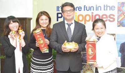 ▲(左3)菲律賓觀光部台灣分處處長雷亞司、經理曾雅惠恭祝同業馬年一馬當先創佳績。
