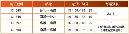 中華航空自4月開始改以A330執行台北─南昌航線,每架次將提升多100個座位的運力。除此之外,4~5月的高雄─南昌航線也將以包機型態經營,每週執行週四航班;6月起將改為定期航班,提供南部民眾赴江西的最佳選擇。