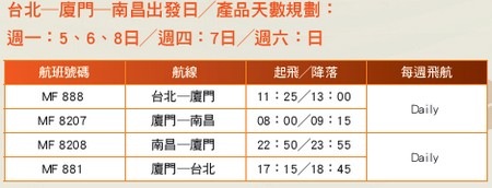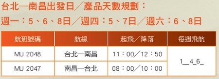 東航台北─南昌航線為午去早回,飛航有週一、四、六,首日抵達還可享有完整的半日觀光。目前業者以東航規劃5、6、8日產品中,以週一出發的6日、週四出發的5、8日、週六出發的8日,最能展現東航江西航線的產品區隔與包裝的優勢。其中,以東航包裝的6日產品,能達到短天數、實惠價格、充裕觀光時間,同時彌補因回程航班時間不佳的劣勢。