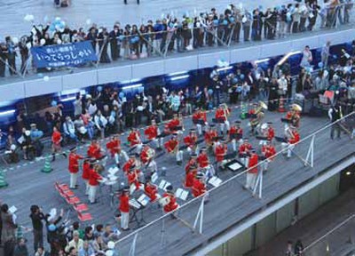 ▲橫濱港前有樂隊、卡通人偶夾道歡迎,藍白氣球齊飛佈滿天空,引來不少當地民眾拍照留念。