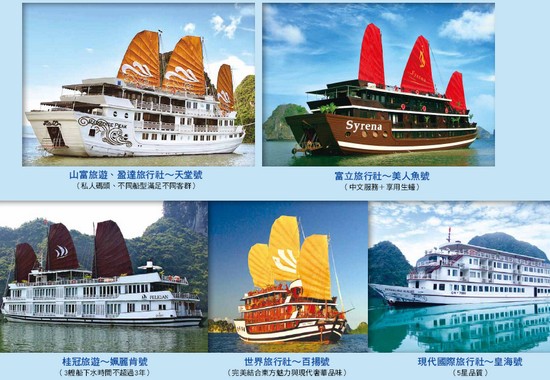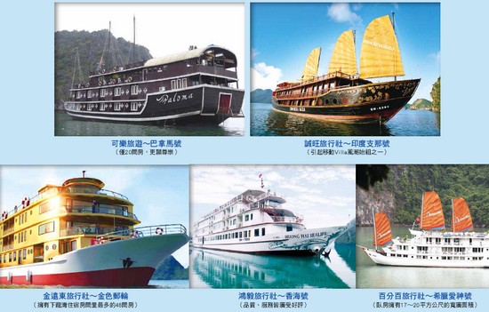 3.下龍灣遊船各具特色,木造仿古船別具風味,鐵殼船歐洲客喜愛。