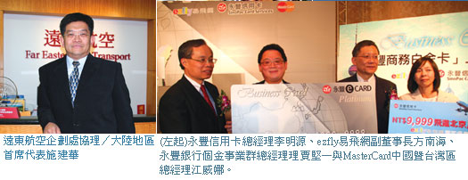 ezfly易飛網日前與永豐銀行合作,推出永豐商務白金卡,ezfly易飛網副董事長方南海表示,除推出大陸地區消費現金回饋最高5%、國外刷卡紅利點數3倍(特定商店)優惠,只要使用永豐商務白金卡在ezfly易飛網購買指定商品,即可獲得近市面上7折的機票優惠價格,此外,還提供台灣地區五星級飯店超值優惠住宿,與上海、北京、香港三城市超值旅遊方案。