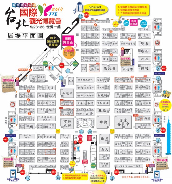 客家委員會首次參展,即以30展位全場之最。展場以「好客.好禮遊─台3線品茗趣遊」為主軸,規劃「客庄.訪勝.品茗香」、「茶香.體驗.親子遊」及「客風.玩味.小旅行」3主題,。同時推薦6條「茶的輕旅行」,介紹客庄生活與茶文化之人文記憶、奉茶精神。展期間推出「好客名人分享會」、「品牌推介會」、「1元競標」、「好客滿額禮」、「每日一物」、「好客卡來店禮」等活動,吸引民眾目光!「台北館」於5╱23上午 11時開館,當天將由觀光傳播局局長孫廷龍與食尚玩家阿諾推薦特調冰品「台北爽」。台北館以台北SUN一夏為主題,規劃3大主題體驗區(涼夏美食品嚐區、文創互動體驗區、戶外避暑景點體驗區),並引進時下最夯的全家霜淇淋在現場販售!