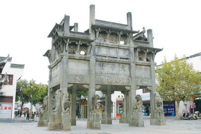 許國石坊,又名大學士坊,俗稱八腳牌樓,建於1584,坊石質為礫凝灰岩(茶園青石),八柱,口字形平面,南北長11.56公尺。許國石坊是徽州石牌坊中最傑出的代表,展現出石坊建造技藝的最高水準,其四柱三樓沖天式石坊在石坊建築史上占有突出地位,全國獨一無二。
