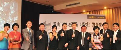 ▲(右起)黃山中青旅中山國際旅行社董事長洪琛、喬安旅行社董事長陳俊良、高雄旅行公會副理事長楊淑惠、黃山旅遊發展股份有限公司副總裁李明浩、高雄市觀光局局長許傳盛、黃山市旅遊委員會副主任項敬賢、瑞都旅行社總經理高渝清、華泰行旅遊總經理莊世棠、黃山溫泉總經理趙颯爽、北航旅行社高雄分公司總經理鄧俊俠。
