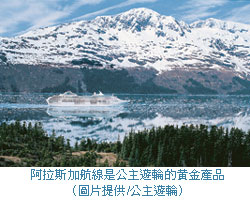 阿拉斯加航線,一直以來都是台灣遊輪市場的主力戰將,居於不敗之地位,相對地,觀光業也就成為阿拉斯加第二大財源,每年到阿拉斯加的旅客超過130萬人次,其中55%為獨立旅客,其他則是參加各種旅遊團。他們之中,52%使用美國本土航空運輸,29%會參加豪華遊輪之旅,12%旅客自行駕車前往,4%搭乘公營郵輪系統,全年旅客中有80%在夏季光臨。從數字上可見有近三分之一的旅客是搭遊輪旅行阿拉斯加的。