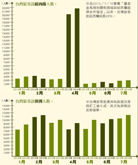 今年澳洲旅遊市場呈現欣欣向榮的面貌,台灣旅客今年1~5月份前往旅遊人次穩健成長,5月份更有雙位數的成長,顯見旅客對於澳洲的情有獨鍾。而紐西蘭部分,雖2月與6月下跌,但其餘月份接呈正向成長,7月同樣擁有7.8%的成長。隨著市場即將邁入旺季,紐澳兩地的旅遊人次也可望持續向上攀升。