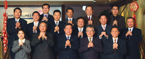 (前排左起)中華航空台北分公司會計室經理李維、中華航空行政組組長謝欽煌、中華航空台北分公司客服中心經理周頡生、中華航空台灣地區處長兼台北分公司總經理陳明堂、中華航空台北分公司客運營業部經理唐慧明、中華航空台北分公司客運營業部副理關兆雄;(後排左起)中華航空台北分公司客運營業部副理許正宜、中華航空台灣地區行銷副總經理兼台北分公司副總經理羅皓明、中華航空台北分公司直客推廣部經理郝光復、中華航空台北分公司客運營業部副理呂虤及中華航空台北分公司行銷策劃部助理梁善綦。