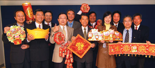 中華航空台北分公司客運營業部經理唐慧明(前排左4)、中華航空台北分公司客運營業部副理許正宜(前排左5)及中華航空台北分公司客運營業部副理呂虤(前排左3)帶領營業部團隊向同業賀新春。