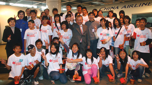 透過舉辦「小小空勤體驗營」,中華航空董事長魏幸雄(第二排中間)表示,「華航因各界的愛護與支持,目前已成為客貨運業績排世界第36大的航空公司,更盼望能用回饋社會的心,使世界之愛也能跨越國界的展開,因此在2007年決定與世界展望會進行合作,相信實現兒童的夢想,就是世界之愛無遠弗屆的開始。」