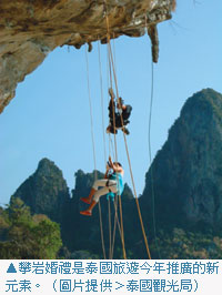 融合了泰國傳統婚禮儀式以及加入現代人顛覆傳統的極限運動思維,攀言婚禮是勇於挑戰各種新鮮、刺激體驗的新人伴侶極佳的新婚方式。