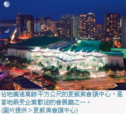 去年夏威夷觀光局初探台灣MICE市場,更由總局MICE總負責人Miachel Murry親自率團來台拜會,夏威夷觀光亞洲代表施春庭說,「總局相當看好台灣市場,今年計畫全力對台推廣夏威夷MICE旅遊。」夏威夷旅遊環境本就深具口碑,近年來更鉅資提升當地MICE環境與相關設施,無論是官方或各大飯店、餐廳都具有一流水準的會議展廳設備,施春庭承諾將協助業者規劃相關產品的包裝或提案。此外,今年正式在台推廣的遊輪產品,亦是夏觀局另一推廣重點,施春庭表示,去年12月起夏威夷遊輪產品首度對台推廣,僅2個月餘的時間獲得廣大迴響,不僅成團率高,更有畢業十數年的醫學院學生選擇作為同學會舉辦地點,施春庭與業者認為短短兩個月時間已有如此成效,未來持續推廣應能創下佳績。此外,今年3月起華航夏威夷航線確定增班,共有10家業者組成PAK合作推廣,目前規劃有6或7天不等的行程,其中大島產品將重返台灣市場。
