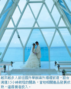 看準婚禮與MICE市場,關島觀光局台灣區辦事處代表簡秀君表示,2007年將全力釋出相關資源,協助業者包裝優質且具競爭力的產品。年初藝人孫鵬應關島觀光局之邀,親往關島考察當地高爾夫球市場,意外發現當地教堂浪漫綺美,當下便選擇關島作為與狄鶯二次婚禮地點,簡秀君透露,屆時亦將針對消費者規劃相關活動。她進一步指出,「關島海外婚禮產品已相當成熟,近幾年來台灣前往當地舉行婚禮旅遊評估的新人亦從30、40對攀升至200~300對,成長數字相當驚人,也是未來婚禮趨勢,值得業者長久耕耘。」值得一提的是,過去多由當地外資婚顧公司包辦婚禮事宜,但「台灣知名茱利亞婚紗委託國外專業投顧公司評估,歷經長達兩年研究發現,關島是最適合台灣婚紗業者投資的海外市場,未來若順利於關島設點,對業者操作具有相當助益。」此外,關島觀光局也定於3月首度推出獎勵旅遊回饋方案,只要人數超過30人以上,就能根據規模享有不同驚喜。