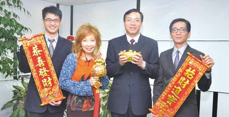 業部副理陳德成(右1)及同仁向同業祝賀羊年順利發大財!