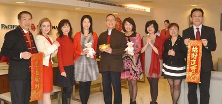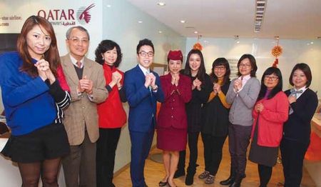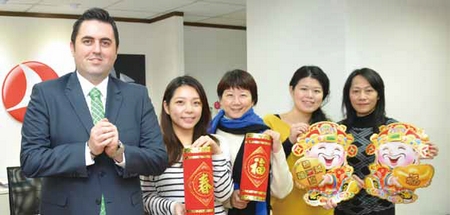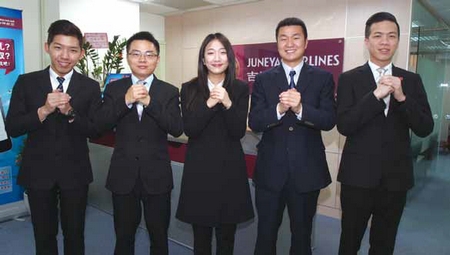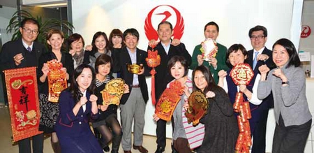 ▲山東航空台灣分公司總經理趙瑜(左3)、協理莊安琪(左2)與同仁向大家行好年。