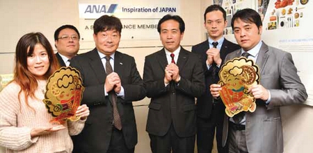 ▲全日空台灣分公司台北支店總經理島一範(左4)、營業部協理上阪克之(左3)、營