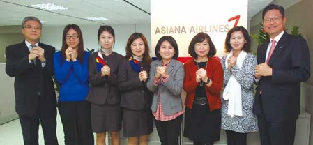 ▲韓亞航空台北分公司總經理鄭鎰佑(右1)、次長楊振德(左1)與其員工齊祝同業羊