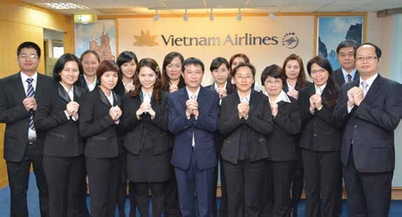 ▲越南航空台灣區總經理杜奎元(前排左5)率領同仁祝同業羊年行大運。