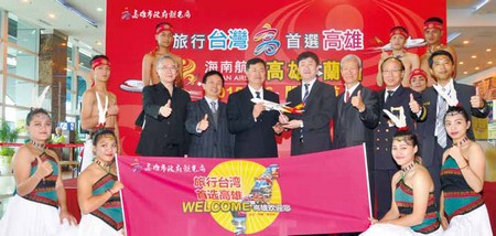 ▲(中排左2起)高雄市旅行商業同業公會理事長沈本立、海旅會高雄辦事分處副主任陳成忠、高雄市政府觀光傳播局局長許傳盛、海南航空台灣分公司總經理邢舟、高雄小港國際機場主任朱耀光、機場海關關長劉國勝、移民署事務大隊隊長蔡英傑。