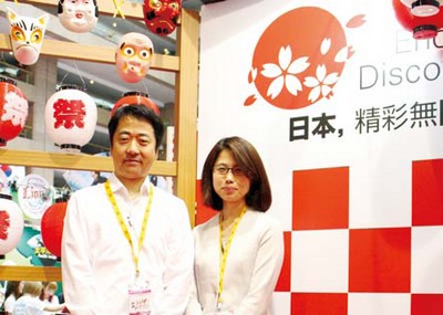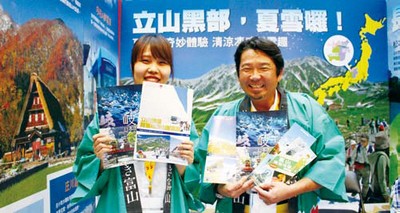 ▲ (右)向日遊顧問公司向井純。此次富山縣、長野縣、岐阜縣以及立山黑部共同出展,除主打立山黑部夏雪樂趣之外,富山五箇山合掌村、長野松本城、岐阜的下呂溫泉也是重點,現場更與同業合作販賣商品強打送客。