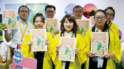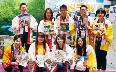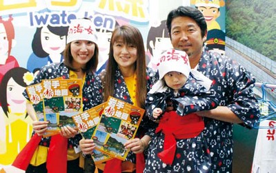 ▲ (左2)日本觀光振興協會東北支部廣瀨浩子。岩手縣此次主打因日劇而聲名大噪的岩手小海女、三陸鐵道、龍泉洞以及淨土之濱等旅遊景點。展攤現場設置小海女變裝區,並舉辦臉書按讚送好禮活動。