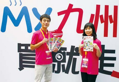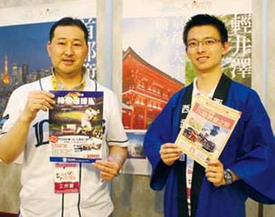 ▲(左起)九州觀光推進機構海外誘致部次長濱田圭史、主任大石宜蓉代表九州七縣宣傳在地觀光。今年與約10家同業合作在展攤直接販售九州旅遊商品,現場更播放九州的觀光宣傳影片,讓民眾能夠直接感受九州魅力。