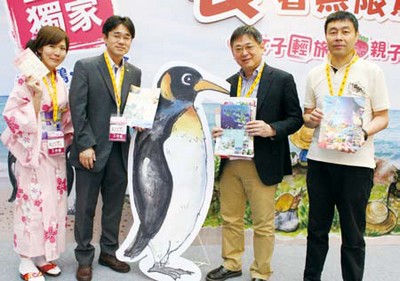▲ (左起)長崎縣觀光連盟海外誘致課主任栗浦惠美、課長町永誠司、佐世保觀光會議協會事業部部長赤木望、豪斯登堡台北營業所所長阮津。長崎縣主打女子輕旅行及能夠與企鵝親密接觸的親子旅遊,現場更大方準備長崎蛋糕與民眾分享。豪斯登堡則力推即將於7月登場的水之王國活動。