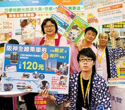▲ (後排左2起)阪急阪神控股株式會社集團經營企劃室事業政策部課長木花圭、阪急交通社西日本營業本部觀光文化振興係長久保伸吾。阪急阪神集團積極參與旅展活動,並於現場販賣阪急、阪神全線乘車券造成口碑,今年加上日幣貶值,價格實惠的票券吸引大批人潮,此外現場更免費贈送實用的旅遊手冊。
