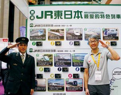 ▲ (右)創造旅行社副董事長兼副總經理高木茂。今年 JR東日本推廣 JR關東地區通票、N’EX東京去回車票等票券,現場更設置JR東日本特色列車票選專區。