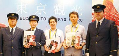 ▲(左2起)東京地下鐵株式會社鐵道本部營業推進室課長補佐齊藤英生、廣報部廣報課課長補佐阪本貴也。此次主要推廣能夠使用於東京Metro和都營全部十三條地鐵的「Tokyo Subway Ticket」,現場更設置車長變裝專區與民眾互動。