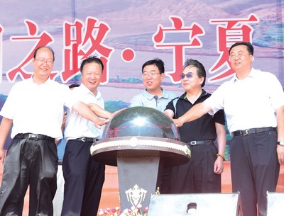 ▲(左起)寧夏回族自治區旅遊協會副會長萬學道、寧夏回族自治區人民政府副主席王和山、海旅會執行會長杜江、台旅會會長謝謂君、中衛市委書記張柱共同觸摸啟動球─正式啟動「第6屆絲綢之路‧寧夏(沙坡頭)大漠黃河旅遊節」。