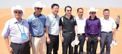 ▲(左起)台灣優質觀光協會理事長朱鳳芝、觀光協會副會長戴啟珩、台旅會董事徐銀樹、鳳凰旅遊董事長張金明、觀光協會秘書長吳朝彥、台旅會董事何榮村、海峽兩岸台北旅展執行長陳映廷於沙坡頭合影。