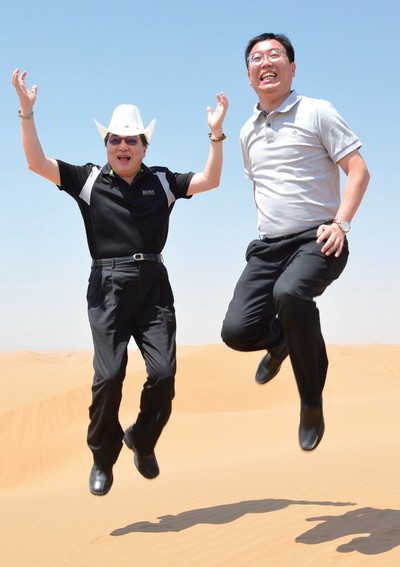 ▲台旅會會長謝謂君(左)與海旅會執行會長杜江在沙坡頭熱血跳躍。