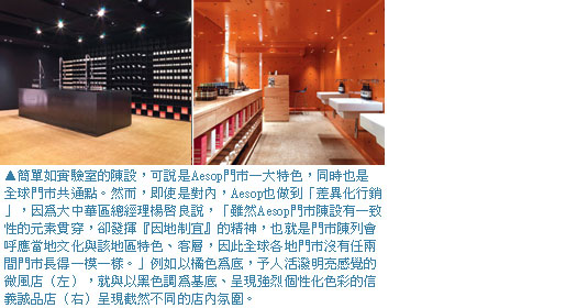 值得一提的是,步入Aesop門市,除了會有讓人聯想起實驗室的陳設之外,還設有超大型洗手台,楊啟良表示,「那正是為了邀請消費者盡情體驗、試用所設置, Aesop從不吝於邀請試用,因為透過親身體驗,才能了解、感受Aesop產品的優異之處。」試用過Aesop的產品後,消費者通常都會訝異於其精純且深層的使用效果,而成為忠實愛用者轉而再向其親友推薦,Aesop靠著愛用者口耳相傳而贏得更多人消費者的認同與信賴,也成為保養品牌界少數不打廣告、無代言人就能熱賣的保養品牌。