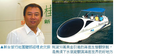 為奠定在帛琉地接社的龍頭地位,PIT先耗資50萬美金引進海底生態觀察艇,再大手筆以15萬美金改建Palau One帆船,目前全世界僅有4艘,而帛琉這艘是從今年3月中旬開始啟用。帛琉海景奇美舉世皆知,搭乘該生態觀察艇,無須透過浮潛或深潛即能將美麗的海底世界景觀盡收眼底。值得一提的是,目前台灣僅有4家旅行社的旅客有機會乘坐,藉此新台帛琉產品與其他同業成功區隔。至於即將於5月1日下水啟用的Paula One帆船,史文揆表示目前進行測試中,未來搭配該帆船,將推出如夏威夷愛之船的晚餐秀與活動。