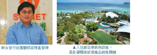 東南亞島嶼多以住宿飯店設施奢華、舒適與現代為宣傳號召,旅遊市場上也由此掀起一陣鼓吹「盡情使用飯店設備、不盲目奔走往返眾多景點,才是島嶼度假真諦」的風潮。對關島市場相當熟絡的溫智傑表示,由於旅遊關島,在飯店停留時間很多,因此飯店設施直接影響旅遊品質,「但關島產品不像東南亞度假島嶼那般,特別強調度假飯店的原因在於,當地飯店房間數量不多,若是一味強調飯店房間,若因房間取得不易而需調整、更改住宿,反而很難對旅客說明。」