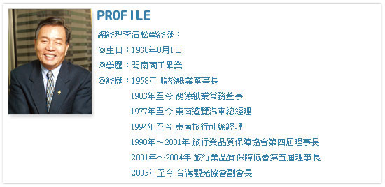 李清松明快的作風及事必躬親的嚴謹,可從詳述12年前進入東南的經過略見一二。「起先我是從紙業起家,對旅遊業完全是外行。」李清松當年在東南面臨財務危機時加入,逐步帶領東南轉型成為全台灣的大型旅行社,「當時做的第一件事就是將東南當時的投資事業中止,只留下旅行社及遊覽車本業,朝著旅遊專業化的方向深耕。」