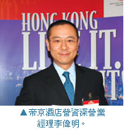 帝京酒店 坐落旺角火車樓上,今年3月甫重新裝修,改建後的帝京酒店以家庭客層與獎勵旅遊客層為主力,因此房間大,房間內設置兩張大床,目前酒店內共有693間房間,團體、自由行客人各半。