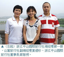 浙江中山國際旅行社總經理蔣一薇表示,旅遊是浙江省近年來極力發展的無煙囪工業,以台灣旅遊業者的市場表現反應最快,成績最好。從數據來看2006年入境江南的旅遊人次有56萬人次,其中台灣人以旅遊為目的的人次就有16萬。山富旅行社旅行副總經理黃迺珍補充,華東地區的旅遊狀況一直很良好,山富在這一次次的考察中,清楚體會到大陸地接社的重要,也將品質的呈現加強,目的就是希望客源的回流率提升,而近幾年的旅遊人次不斷增加,已經表現出山富耕耘的成果。浙江中山國際旅行社董事長蔣慧明則強調,感謝山富旅行社的考察及參與荷花會的慶典,並給予浙江中山國際旅行社在景點考察上的意見,未來將更積極與山富旅行社合作,拓展台灣旅遊市場。