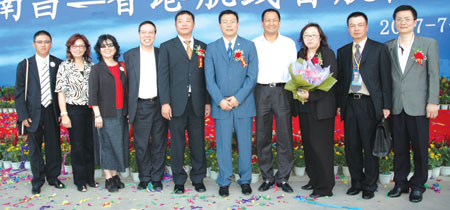 ▲台灣業者對於香港航空開通南昌航線皆感興奮,為期三天的首航考察團,台灣業者與香港航空高層、江西當地地接社充分溝通、交換意見。(左起)雄峰旅行社總經理施懿、廈航旅行社總經理許淑玲、北極星國際旅行社票務部副總經理李寶秀、鳳凰國際旅行社總經理廖文澄、西南旅行社總經理李逸、香港航空董事總經理李強、中華航空香港分公司總經理吳治富、香港航空營業市場部總經理袁羅玉蓮、香港航空中國地區首席楊帆與香港航空台灣辦事處協理劉學宏。