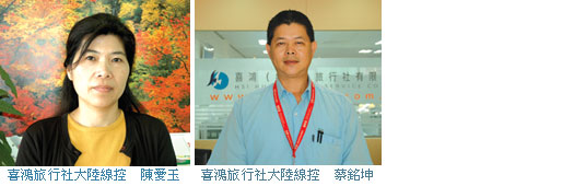 喜鴻旅行社大陸線控蔡銘坤表示,目前喜鴻大陸線經營的主要區塊為華南及華東兩部分,華南地區以桂林、貴州和昆大麗為主軸,華東地區則有張家界、九寨溝以及江南地區等地,另外北京和山東等地也有規劃,其中又以華南地區為大宗。蔡銘坤表示,大陸市場在台灣發展多年,景點發展上已有一定的成熟度,因此針對各大主要熱門景區,就必須從不同於以往的角度切入,推陳出新做更新的包裝,才足以滿足旅客的多變需求,以桂林地區為例,除了一般以山水景色為主的行程安排之外,也推出以主題樂園為訴求的特色行程,像是樂滿地度假村以及愚智雕塑樂園等等。