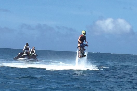 水上鋼鐵人是塞班島2017年最新推出的水上活動,動力 十足的噴水式飛行設備,最高時數可達25Mph,帶給旅客 鋼鐵人般的酷炫體驗。練習上手還能嘗試凌空翻騰、海豚 入水、360度旋轉等特殊技巧。而林語萱(Sherry)初次體 驗,操作相當穩定,獲得教練群的一致讚賞。