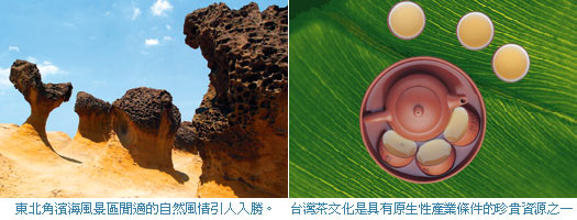 以台灣高山茶業觀光而言,從茶器選擇、採茶員的訓練、茶葉的品嘗、茶種美學鑑定,構成豐富系統,30年來從產茶、製茶、銷售茶葉、甚至茶藝博物館的設立,每一細節都講究,架出文化產業優勢,製成觀光核心,就有其價值贏得消費與尊嚴,更不容易一次就耗盡觀光價值,因為自我品牌標竿一旦設立,就加強了原發性的深度,跳脫平面進展,從立體思維上刻畫出別人不能操作的市場機制,帶動台灣觀光新紀元。
