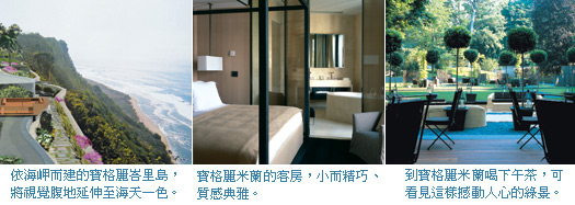 以1億4千萬美元打造的寶格麗米蘭飯店,共58間房間,其中有7間頂級套房(包括一間總統套房),每間客房隱密而精巧,1/3空間為沐浴間,金色網簾屏風為隔間,襯托寢室質感;SPA的馬賽克游泳池鋪陳了炫目金箔。