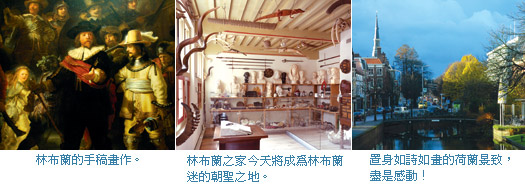 擅長光影對比及細緻處理畫風的林布蘭,由別於當時以蛋彩畫為顏料、人物畫的主流,便以自行調配油畫顏料、將市井小民及景物納入畫布。據本刊資料顯示,2006年荷蘭各地會全力推廣林布蘭相關慶典及藝術展覽,阿姆斯特丹將會是今年林布蘭特展最盛大、規模也最完整的城市。荷觀局台灣網站也為林布蘭400週年誕辰紀念做一個特別的網站,歡迎有興趣的同業上網瀏覽。