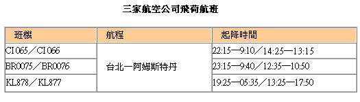 華航:每天飛往阿姆斯特丹的班機為1班,搭乘波音747-400客機,座位總計397個。由於與業者共推的「最愛歐洲:花賞荷蘭篇」以及「荷蘭花香比德童話」行程,團體機位銷售情形不錯。