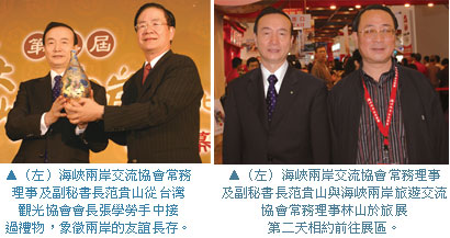 由台灣觀光協會與海峽兩岸交流協會合辦,以「展中展」與ITF同步舉辦的第二屆海峽兩岸旅展,今年由海峽兩岸旅遊交流協會常務理事及副秘書長范貴山受秘書長劉克智之託率團抵台,共有來自大陸31省市的155個單位、近300位業者代表參加;展場內劃分為東北、華北、西北、西南、華東、中南、旅行社專區,以及特別設置的2008年北京奧運與2010年上海世博展示區,攤位總計255個。