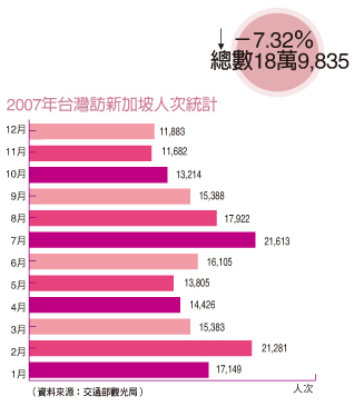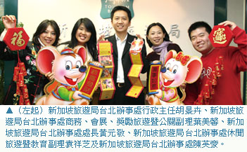 新加坡旅遊局台北辦事處處長黃元敬表示,「2007年感謝業者的努力推廣及銷售,2008年請持續對新加坡旅遊、行銷的支持。」此外,新加坡不僅擁有30年以上籌備大型獎勵旅遊的經驗,所憑藉的就是不斷地在觀光資源及政策方面的創新與投資,從去年啟用的濱海灣水舞台、聖淘沙捷運,到今年4月正式營運的新加坡摩天觀景輪以及2009年12月完工的濱海灣金沙綜合度假聖地、2010年完工的聖淘沙名勝世界等新景點,都將為獎勵旅遊注入新活力,推出更新穎的旅遊產品。在2007年非常新加坡商務及獎勵旅遊專家獎項由百威、喜達、康福、雄獅及東南等旅行社所獲得,今年袚s加坡旅遊局將提供業者更多資源,並加強對南部業者的推廣,保持密切合作。